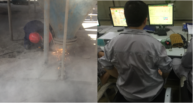 他们为了环保本部的生产正常运行,冒着酷暑,在常人难以想象的恶劣环境下对设备进行检查,不到5分钟的时间,整个人早已浸透在汗水中,又不到一会儿,衣服被高温重新烤干,把设备修好,整个人湿了干,干了湿要好几次。当发现我在给他们拍照时,可爱的员工们不让拍,因为他们很朴实,所以有的照片我都是背向偷拍的。